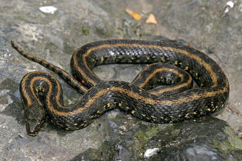 - Tête relativement triangulaire, voire très triangulaire lorsque l'animal se sent menacé et adopte l'attitude de "bluff" typique des Natrix.